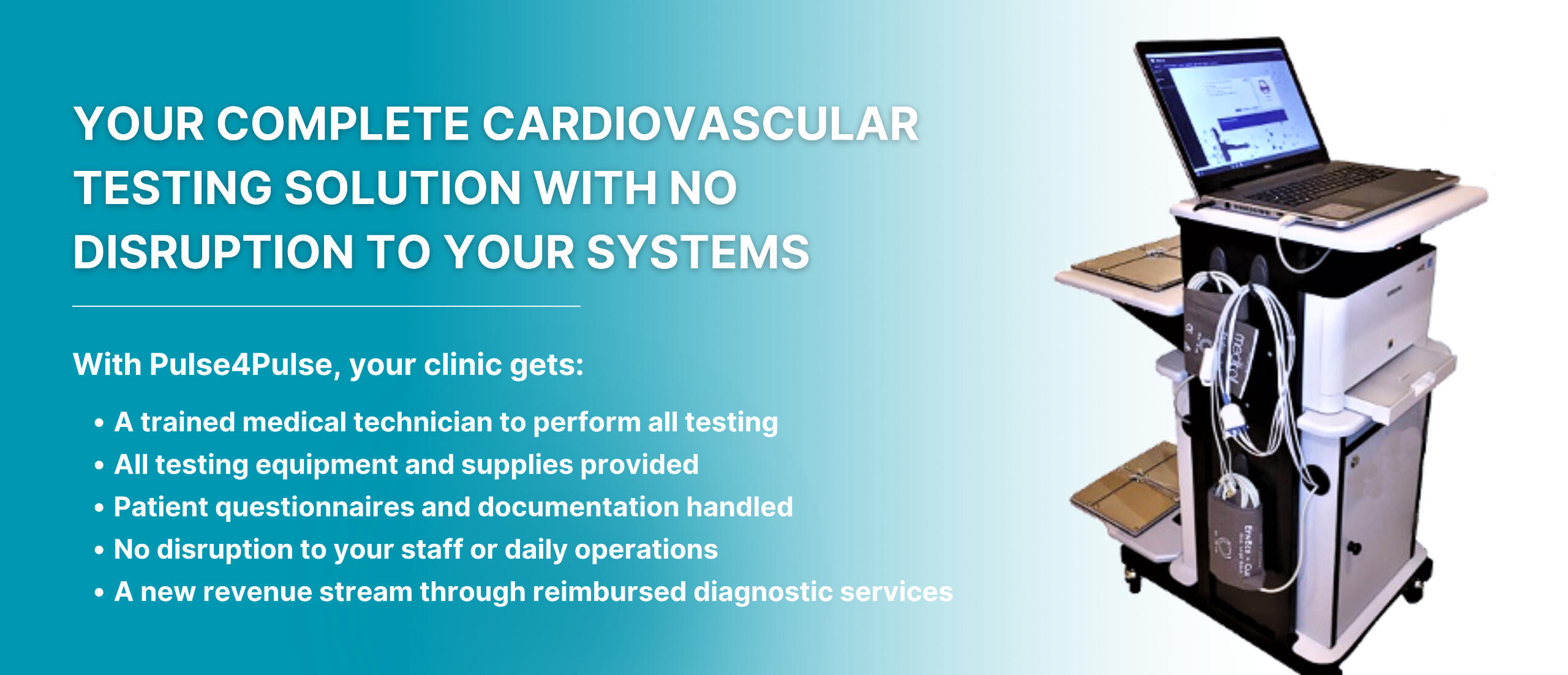 With Pulse4Pulse, you can seamlessly deliver advanced cardiovascular screenings right in your clinic in less than 30 minutes. We provide everything you need, including equipment and trained technicians, and you will only receive an invoice after your patient’s insurance has reimbursed you.3 of the 4 patients who develop Peripheral Artery Disease DO NOT show symptoms.Traditional screening methods often miss the signs of Peripheral Artery Disease (PAD) until it’s too late. And patients with PAD are 6 times more likely to die from cardiovascular disease within 10 years of diagnosis.That is why we developed Pulse4Pulse: to detect the warning signs of PAD up to 10 years earlier than other standard methods.PAD patients have an increased risk of Stroke, Heart Attack, Ischemic Attack, Painful Diabetic Neuropathy, Pain with Walking, and Amputations. Now you can help your patients avoid those outcomes with early detection and add a profitable service to your office.